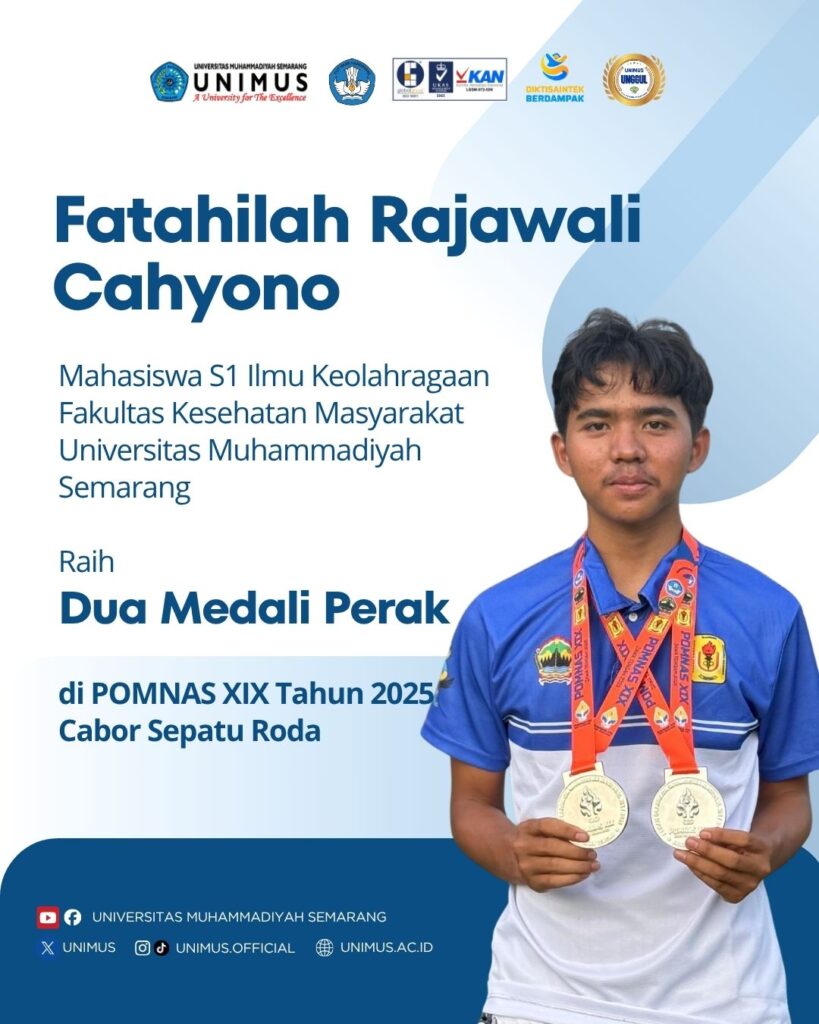 October 3, 2025 2025-10-03 3:20Fatahilah Rajawali Cahyono, Mahasiswa Ilmu Keolahragaan Sumbang Dua Medali Perak untuk UNIMUS di POMNAS XIX Tahun 2025 Cabor Sepatu Roda