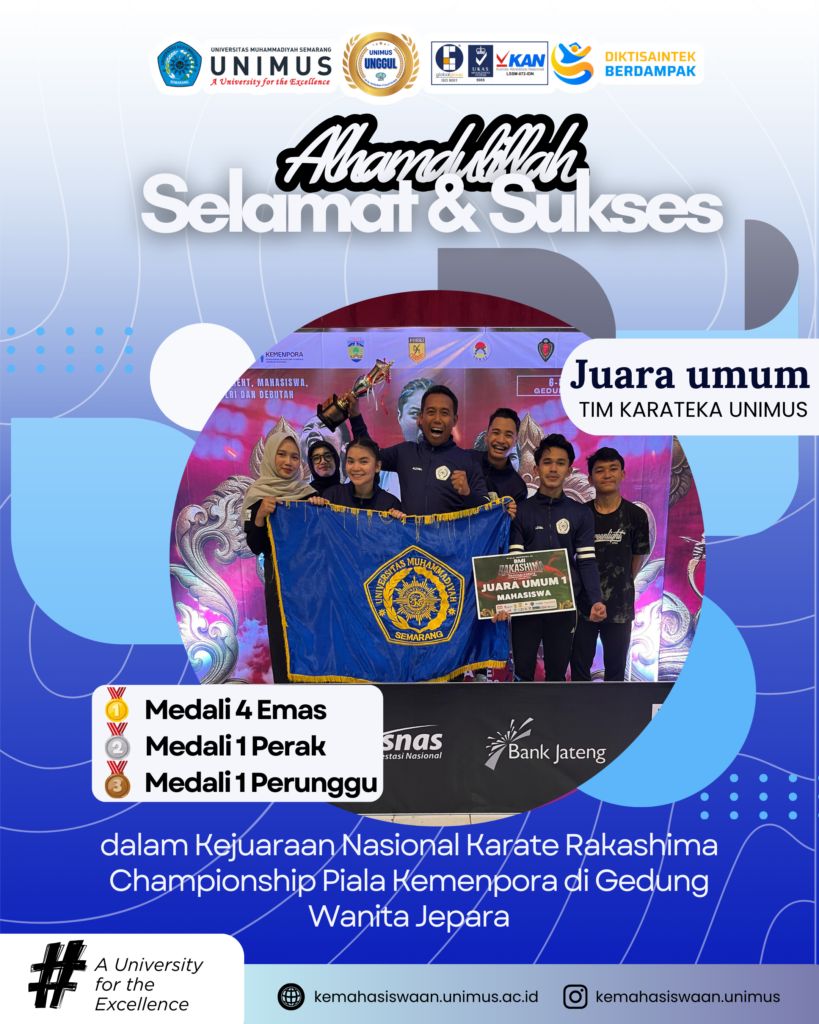Semarang – Tim Karate Universitas Muhammadiyah Semarang (UNIMUS) kembali menorehkan prestasi membanggakan di tingkat nasional dengan meraih Juara Umum I pada ajang Rakashima Championship Piala Kemenpora kategori mahasiswa. Kejuaraan bergengsi tersebut diselenggarakan di Gedung Wanita Jepara dan diikuti oleh berbagai perguruan tinggi dari seluruh Indonesia.