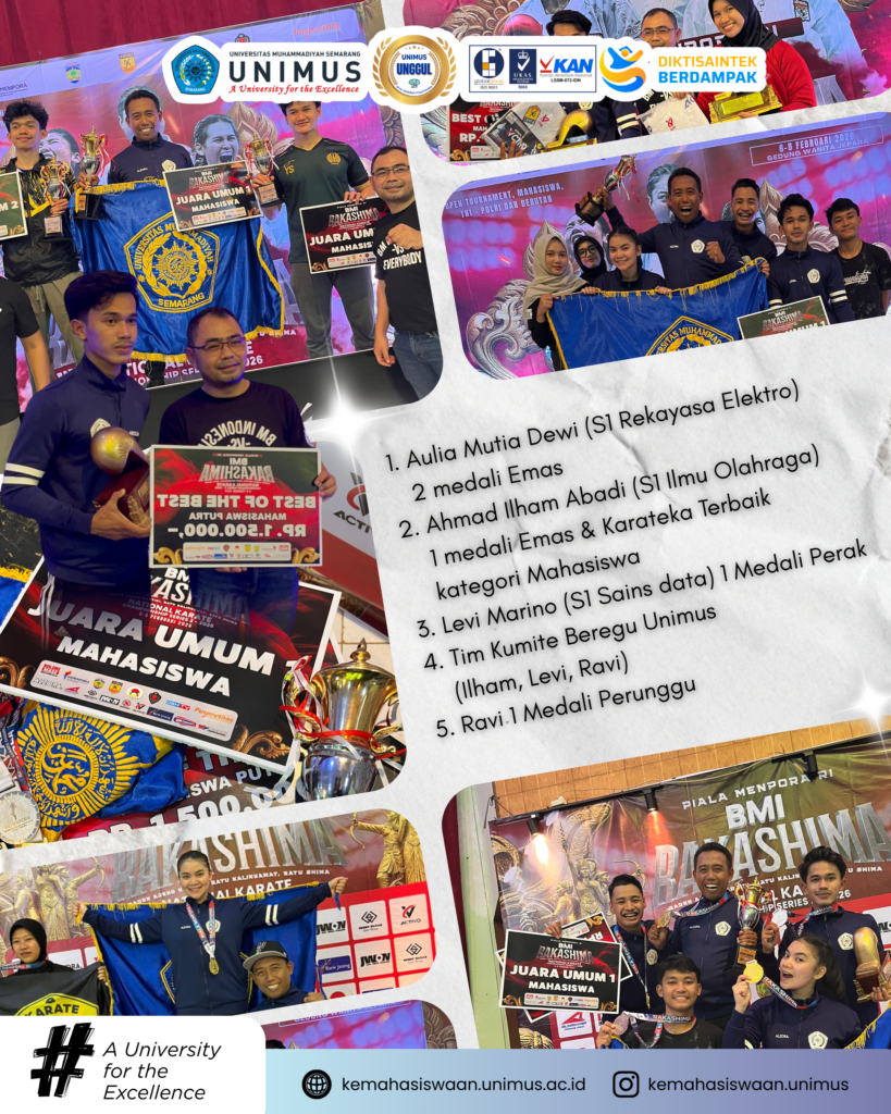UNIMUS berhasil meraih total 4 Medali Emas, 1 Medali Perak, dan 1 Medali Perunggu, sekaligus mengantarkan UNIMUS sebagai Juara Umum I kategori mahasiswa. Prestasi ini menjadi bukti nyata kualitas pembinaan dan semangat juang mahasiswa UNIMUS di bidang olahraga karate.